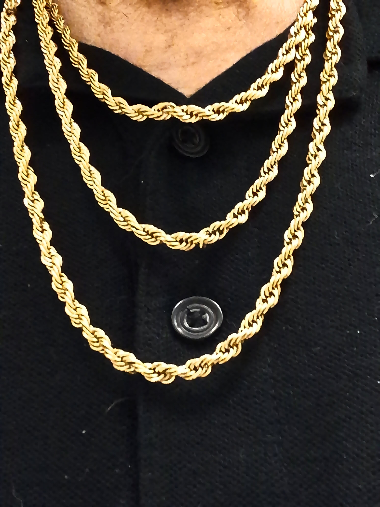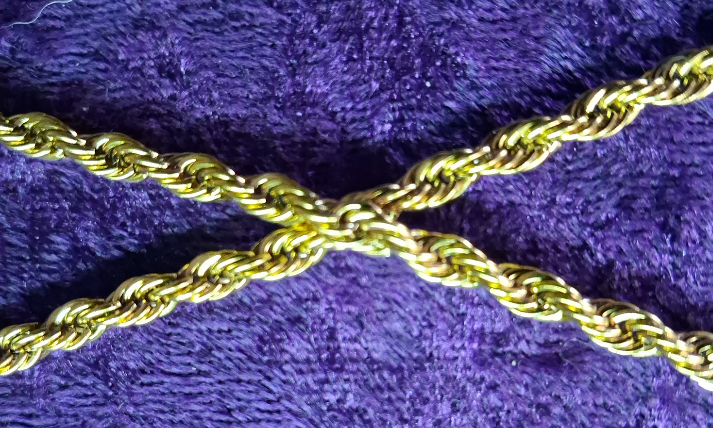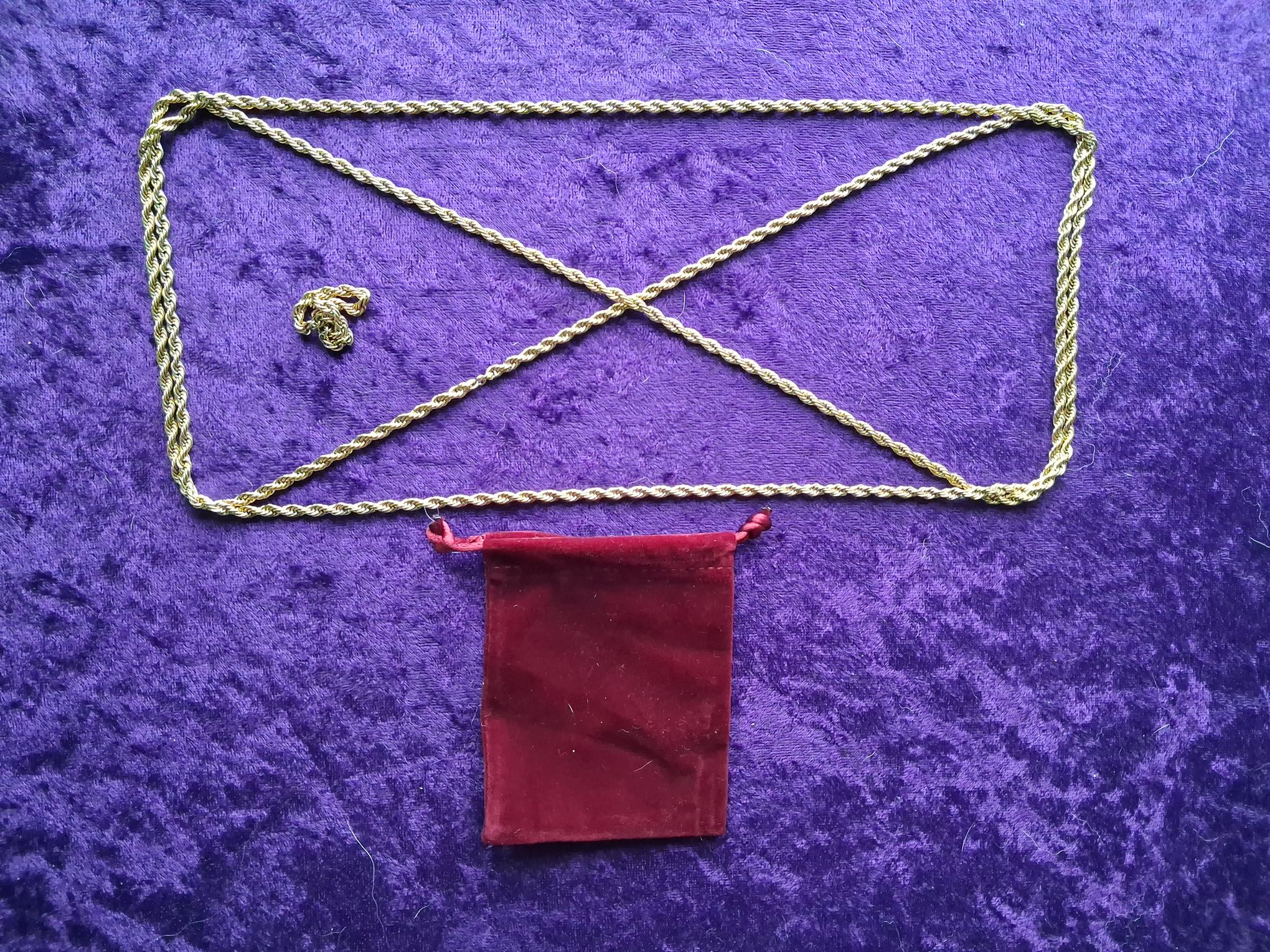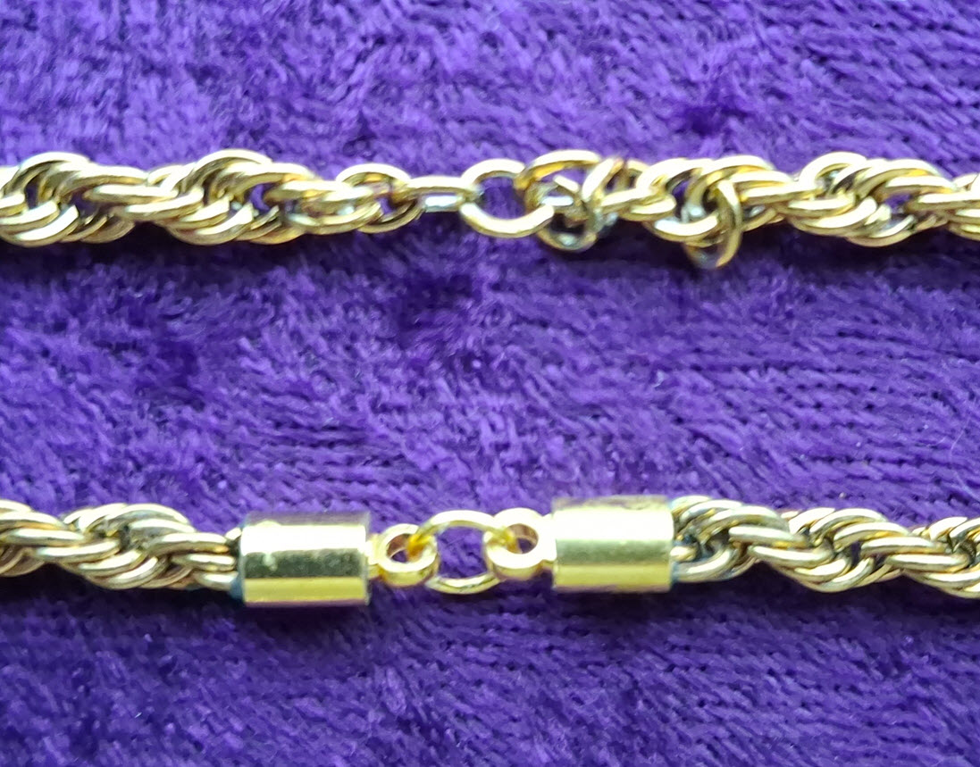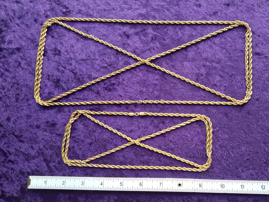 The larger gold Cuban style chain can be used for the routine, but the pattern is easier to follow. I’m showing it if you want a necklace with clasp made. 18″ to 24″. $18 to $20 including shipping. The rope chains can be made into necklaces or ankle bracelets. Specify length and gold or silver. Usually 8″ to 10″. $10 to $12 including shipping if ordered with something else.